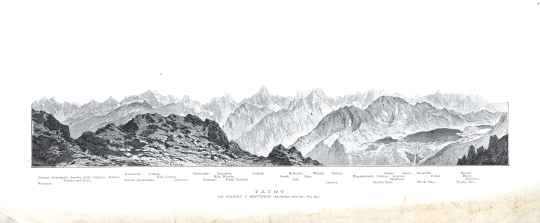 Widok na Tatry z Krzyżnego. Panorama Tatr Wysokich od Jagnięcego Szczyty po Krywań. Na wchodzie widoczne szczyty Tatr Bielskich: Hawrań i Płaczliwa Skała. Na zachodzie wgląd w Dolinę Pięciu Stawów Polskich. Na pierwszym planie Wołoszyn. Fototypia sygnowana: Walery Eljasz, po lewej H. & H. ph. (Husnik & Hausler ph.) - producent klisz metodą fotochemigraficzną.