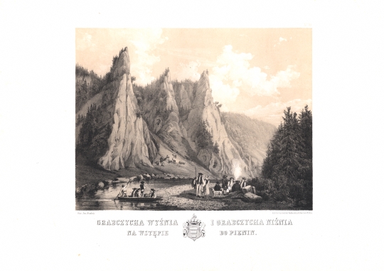 Widok na skały zwane Grabczycha Wyżnia i Grabczycha Niżnia w Pieninach. Poniżej szczytów pasące się bydło i pasterz. Na pierwszym planie rzeka Dunajec, na niej łódka z ludźmi. Na brzegu grupka górali i turystów przy ognisku. Rycina sygnowana pod odbitką z lewej: Rys. Józ. Szalay, z prawej: Artystyczny Instytut Reiffensteina & Röscha w Wiedniu (litografia), poniżej napis jak w tytule rozdzielony herbem. U góry po prawej: No. 10.