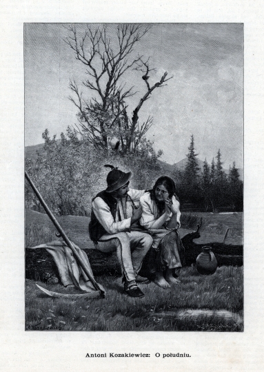 Reprodukcja obrazu A. Kozakiewicza. Scena rodzajowa z Podhala. Góral, kosiarz siedzi na pniu i odpoczywa po pracy. obok siedzi góralka, która przyniosła mu jedzenie. Drzeworyt sygnowany na płycie A. Kozakiewicz i R. Jericke.