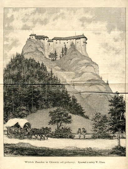 Widok na Zamek Orawski nad miejscowością Orawskie Podzamcze od północy. Widoczny Wysoki Zamek. Na pierwszym planie droga, na której znajduje się "budka" ciągnięta przez dwa konie. Na wozie siedzi woźnica i turyści. Przy drodze ogrodzenie, na którym siedzi dwóch górali. Fototypia sygnowana Walery Eljasz 1884. Po prawej stronie monogram wiązany AG ph. [Angerer, Göschl] - producenci kliszy metodą chemigraficzną.
