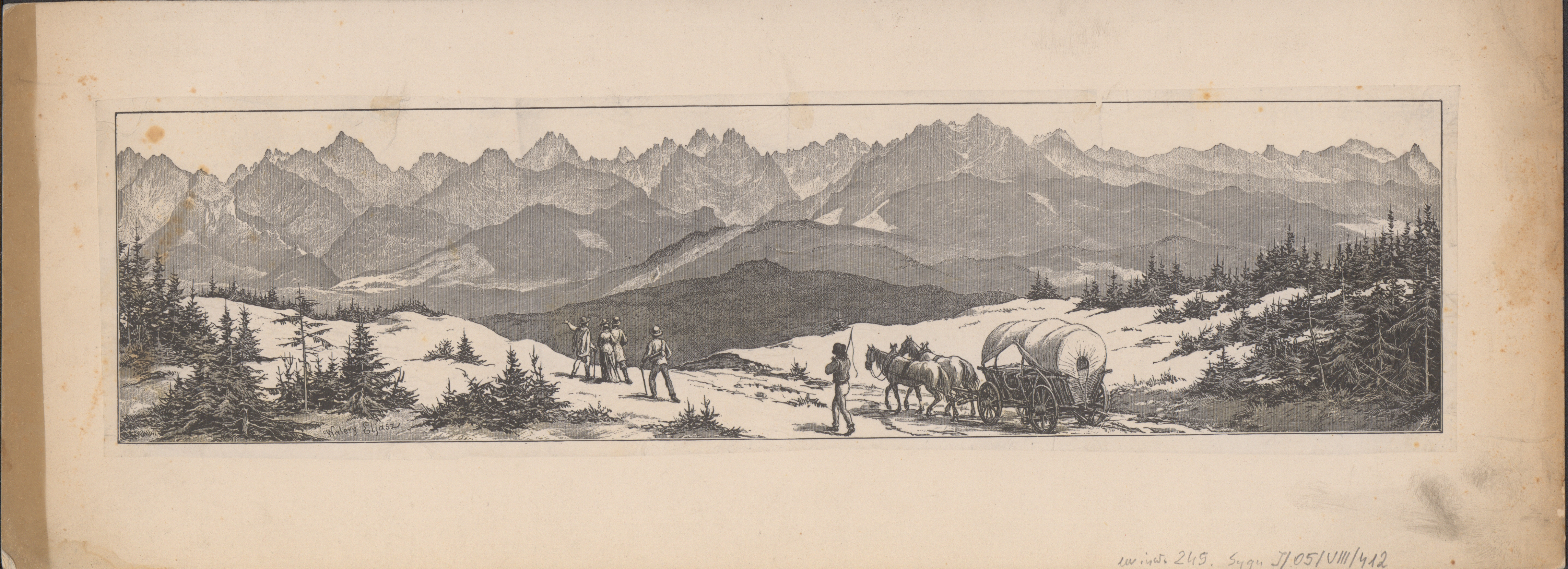 Widok na Tatry z Głodówki. Na pierwszym planie droga do Morskiego Oka, na której stoi grupa turystów oraz "budka" z parą kani i góral - woźnica. W tle panorama Tatr od Hawrania w Tatrach Bielskich na wschodzie, po Giewont w Tatrach Zachodnich na zachodzie. Klisza wykonana metodą fotochemigraficzną, sygnowana po lewej: Walery Eljasz. Po prawej monogram wiązany AG ph. [Angerer, Göschl] - producent klisz drukarskich. Rysunek reprodukowany na przeźroczystym podłożu (kalka techniczna) naklejonym na sztywny karton.