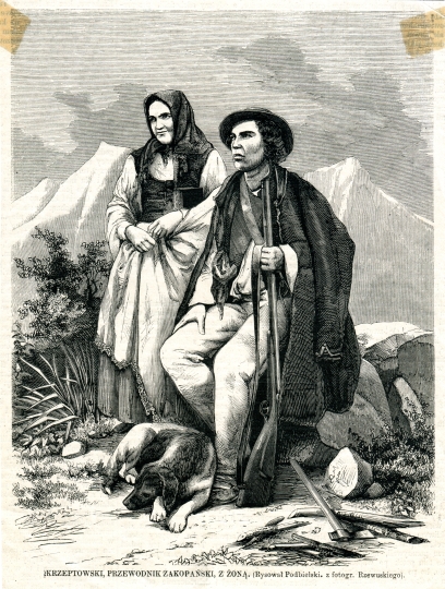 Postać przewodnika zakopiańskiego Krzeptowskiego w stroju góralskim, w kapeluszu na głowie siedzącego na głazie i wspierającego się na strzelbie. Po lewej stronie postać kobiety w stroju góralskim. U nóg przewodnika spoczywa pies, po prawej stronie na pierwszym planie ciupaga. W tle tatrzańskie szczyty. Rycina wykonana na podstawie fotografii Walerego Rzewuskiego, sygnowana na płycie "HKubler". Pod il. napis jak w tytule i dalej: "(Rysował Podbielski z fotogr. Rzewuskiego)".
