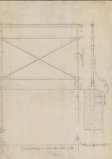 Zapewne jeden z rysunków technicznych projektu elementów metalowych niezbędnych do wykonania pierwszego mostu metalowego na Wiśle w Krakowie dołączony do zamówienia na ich wykonanie złożonego w zakładach przemysłu metalowego w zakopiańskich Kuźnicach w połowie XIX w.