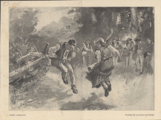 Reprodukcja obrazu S. Batowskiego-Kaczora przedstawiająca tańczącą parę młodych górali na tle tatrzańskiego krajobrazu. Po lewej stronie kapela i przyglądający się górale. Reprodukcja sygnowana: S K Batowski.
