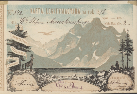 Karta Legitymacyjna Towarzystwa Tatrzańskiego wypełniona na rok 1878, Nr. 542 dla Stefana Muczkowskiego. Litografia barwna przedstawiająca Morskie Oko z panoramą otaczających go szczytów. Na pierwszym planie kozica, świstaki i świerki. Na dole podpisy uprawnionych osób Wydziału Towarzystwa: Sekretarz L. Świerz, (wice)Prezes Wł. L. Anczyc, Podskarbi A. Bondzewicz. Pod ryciną: Lit. M[arcina] Salba w Krakowie. Niesygnowana.