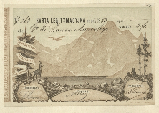Karta Legitymacyjna Towarzystwa Tatrzańskiego wypełniona na rok 1883, Nr. 263 dla ks. Marcelego Zaussa. Litografia barwna przedstawiająca Morskie Oko z panoramą otaczających go szczytów. Na pierwszym planie kozica, świstaki i świerki. Na dole podpisy uprawnionych osób Wydziału Towarzystwa: Sekretarz L. Świerz, Prezes M. Rey, Podskarbi D. Wierzbicki. Pod ryciną: Lit. M[arcina] Salba w Krakowie. Niesygnowana.