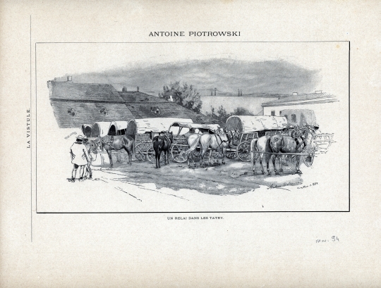 Ilustracja przedstawia popas - odpoczynek w czasie podróży w Tatry w latach 80. XIX wieku. Na pierwszym planie kilka koni, wozy i górale na placu przed karczmą. Rycina sygn. na płycie Antoni Piotrowski Kraków r. 1884. Po prawej stronie monogram wiązany AG ph. [Angerer, Göschl] - producent klisz drukarskich metodą fotochemigraficzną.