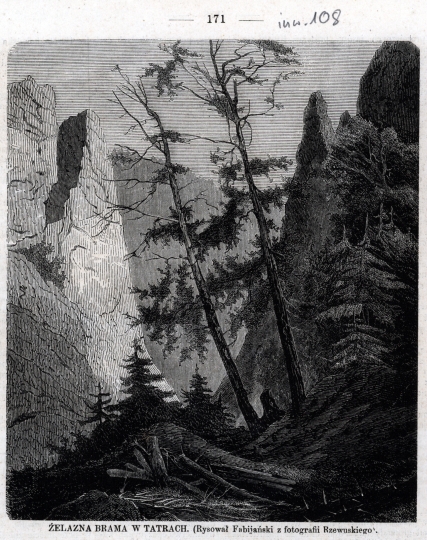 Rysunek wykonany na podstawie fotografii W. Rzewuskiego przedstawia pejzaż z Doliny za Bramką. Na pierwszym planie pochylone drzewa liściaste, po bokach węglanowe skałki. Niesygnowana.