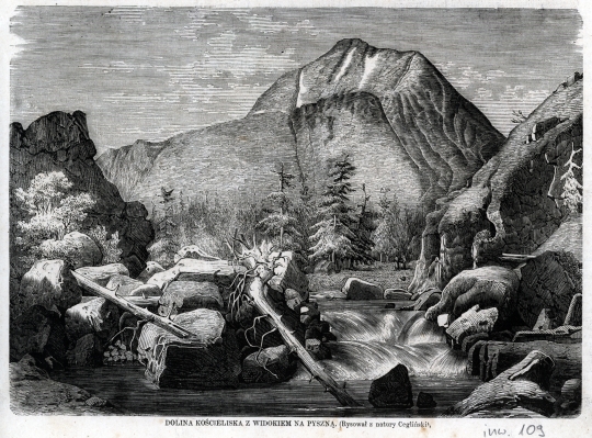 Rysunek z natury J. Ceglińskiego przedstawia pejzaż z Doliny Kościeliskiej. Na pierwszym planie potok Kościeliski, w tle wyniosłe szczyty Błyszcz i Bystra, którą w XIX wieku określano nazwą Pyszna. Niesygnowana.