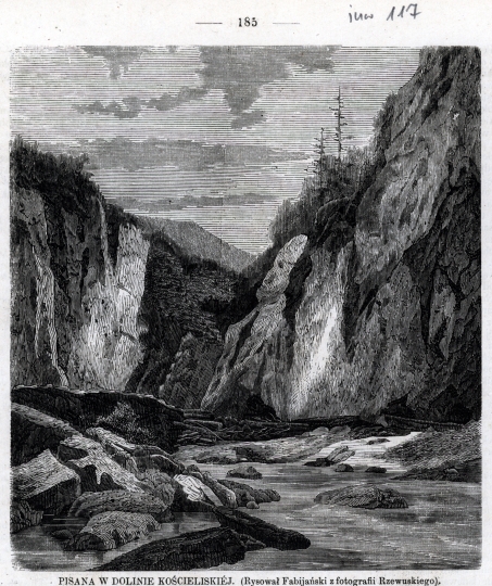 Widok z Doliny Kościeliskiej. Pisana Skała i wypływ potoku Kościeliskiego z Jaskini Wodnej pod Pisaną. Rycina jest lustrzanym odbiciem rzeczywistego widoku ! Niesygnowana.