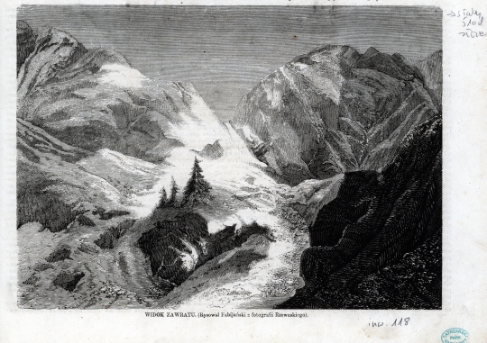 Widok na przełęcz Zawrat i otaczające ją szczyty. Pod przełęczą rysownik umieścił grupę świerków nie występujących w warunkach naturalnych na tej wysokości. Sygnowana: EKU... [?]