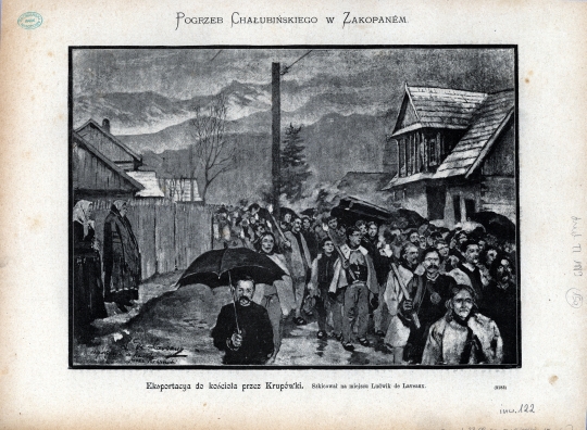 Rysunkowy reportaż z pogrzebu Tytusa Chałubińskiego w Zakopanem. Scena ukazuje uroczyste wyprowadzenie zwłok do kościoła przed pogrzebem. Kondukt, w którym znajduje się liczna grupa górali przechodzi ulicą Krupówki.