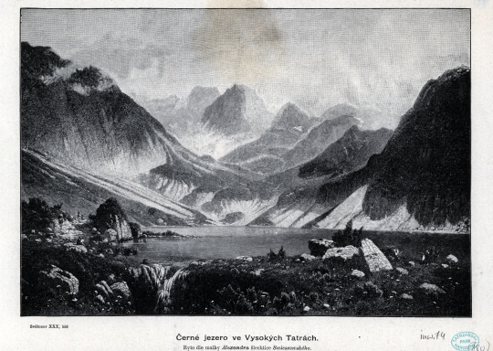 Widok na Czarny Staw Gąsienicowy i jego otoczenie. W tle Kozi Wierch. Reprodukcja obrazu "Pejzaż alpejski" Aleksandra Świeszewskiego.