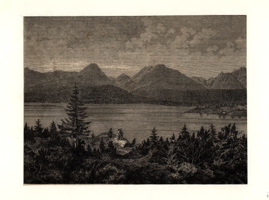 Widok na Szczyrbskie Jezioro i otaczające je szczyty. W tle Wielkie Solisko, Szczyrbski Szczyt, Skrajna Baszta i Kopa Popradzka. Na pierwszym planie turyści nad stawem. Rycina wykonana na podstawie fotografii Karola Divalda, fotografa z Preszowa. Rycina sygnowana przez rytownika: R. W.