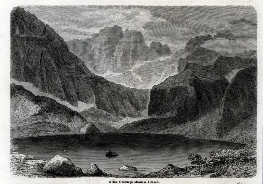 Widok na Czarny Staw Gąsienicowy i jego otoczenie. w tle Kozi Wierch. Na pierwszym planie na stawie turyści pływający na tratwie. Sygnowana na płycie K. Przykorski.