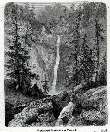 Widok na wodospad Siklawica w Dolinie Strążyskiej. Przy wodospadzie turysta. Sygnowana na płycie monogramem E.C. [?]
