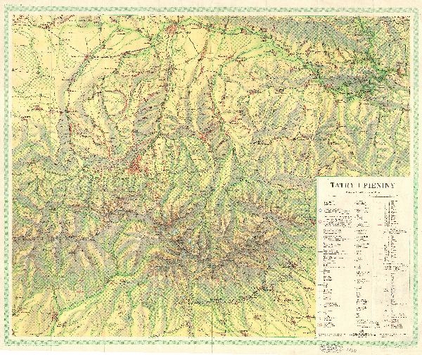 Mapa turystyczna, poziomicowa obejmująca Tatry Zachodnie, Tatry Wysokie, Tatry Bielskie i Pieniny. Zaznaczone granice parków narodowych, rezerwatów ścisłych. Przystanki PKS i ČSAD.