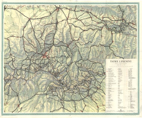 Mapa turystyczna obejmująca Tatry i Pieniny. Rzeźba zaznaczona przy pomocy poziomic, cieniowania i punktów wysokościowych. W obszarze wysokogórskim rysunek skał. Sieć hydrograficzna. Zaznaczono obszary zalesione. Komunikacja - koleje, drogi, koleje linowe. Osadnictwo. Zaznaczono granice państwowe, granice parków narodowych i rezerwatów ścisłych. Obiekty turystyczne, zabytki, obiekty użyteczności publicznej ,szlaki turystyczne, nartostrady. Objaśnienia w j. pol., fr., niem. i ros. Odręcznie zaznaczono trasy wycieczek szkoleniowych Koła Przewodników Tatrzańskich w Zakopanem.