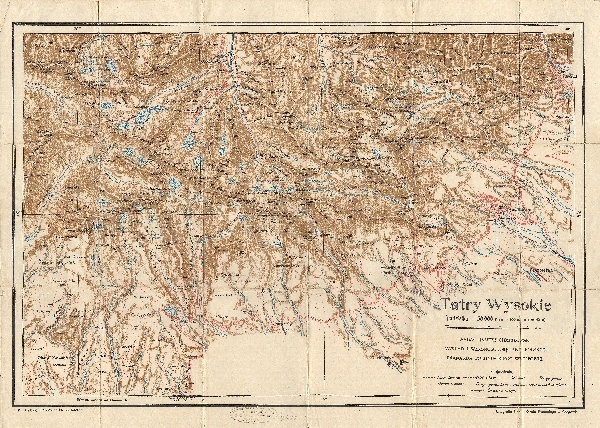 Mapa z rysunkiem rzeźby terenu i skał oraz cieniowana obejmująca Tatry Wysokie i Tatry Bielskie. Zaznaczone granie, ważniejsze szczyty, sieć rzeczna, jeziora. Drogi i szlaki turystyczne. Objaśnienia.