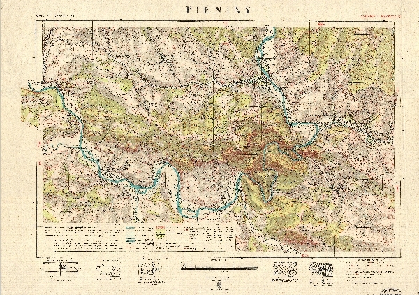 Mapa obejmująca obszar Pienin. Rzeźba przedstawiona metodą poziomic i cieniowania. W obszarze wysokogórskim rysunek skał. Sieć hydrograficzna. Zaznaczone obszary zalesione. Komunikacja - drogi. Osadnictwo. Zaznaczone szlaki turystyczne i schroniska. Objaśnienia znaków topograficznych i turystycznych. Poza ramką wyszczególnienie przedmiotów zabytkowych oraz schematyczne mapki położenia mapy na arkuszach, szkic podziału administracyjnego, szkic sytuacyjny obszarów chronionych, źródła opracowania i wykonawcy.