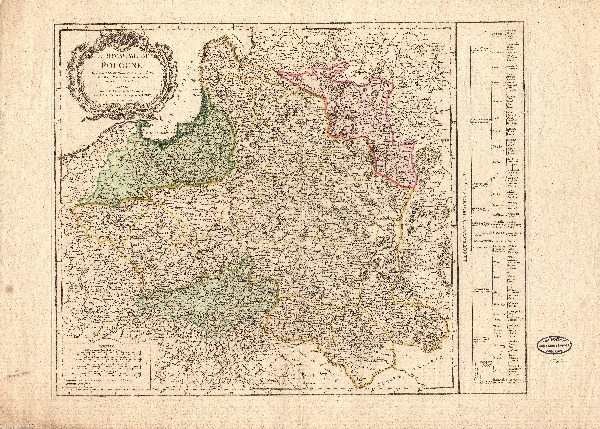 Mapa administracyjna obejmująca ziemie Królestwa Polskiego. Rzeźba przedstawiona metodą kopców. Sieć hydrograficzna. Osadnictwo. Zaznaczone obszary zalesione i tereny podmokłe. Naniesione granice administracyjne oraz przynależność do Prus i Rosji. Podziałka liniowa. Opis podziału administracyjnego Polski.