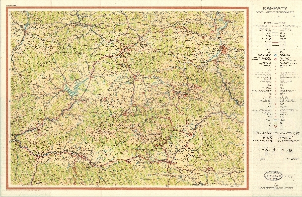 Mapa turystyczna obejmująca obszar konwencji turystycznej w otoczeniu Tatr i Pienin. Rzeźba zaznaczona poziomicami. Sieć hydrograficzna. komunikacja - drogi i koleje, koleje linowe i wyciągi narciarskie. Osadnictwo. Zaznaczone obszary zalesione. Zaznaczone granice obszaru konwencji turystycznej. Przejścia graniczne. Obiekty turystyczne i zabytki oraz obiekty użyteczności publicznej. Zaznaczone granice parków narodowych. Legenda w j. pol., ang., cz., niem.