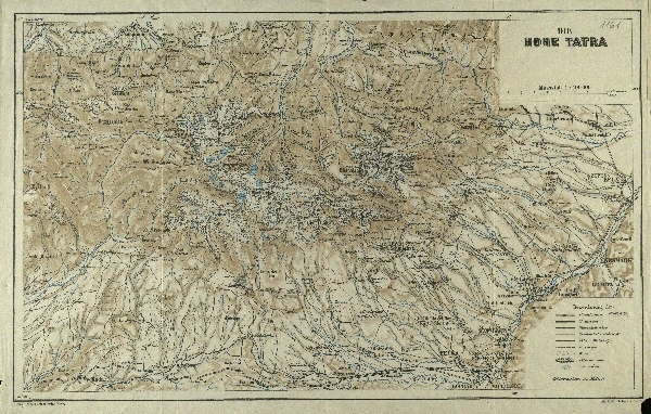 Mapa załącznikowa do przewodnika A. Otto obejmująca Tatry Wysokie i część Tatr Zachodnich po Dolinę Kościeliską. Mapa przeglądowa, turystyczna. Rysunek skał i cieniowanie. Punkty wysokościowe. Rzeki i stawy. Zaznaczone drogi.