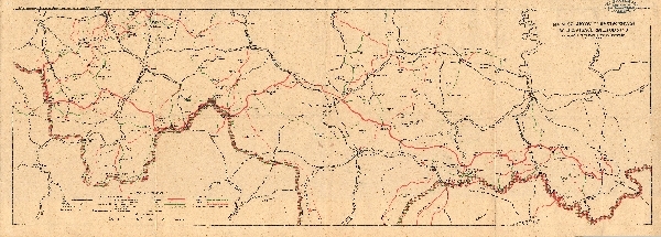 Mapa turystyczna obejmująca Beskidy Zachodnie od Bielska-Białej po Nowy Sącz. Zaznaczone ważniejsze rzeki. Komunikacja - drogi i koleje. Osadnictwo. Zaznaczone szczyty górskie z podaniem wysokości. Zaznaczone szlaki turystyczne istniejące i projektowane oraz schroniska. Legenda.