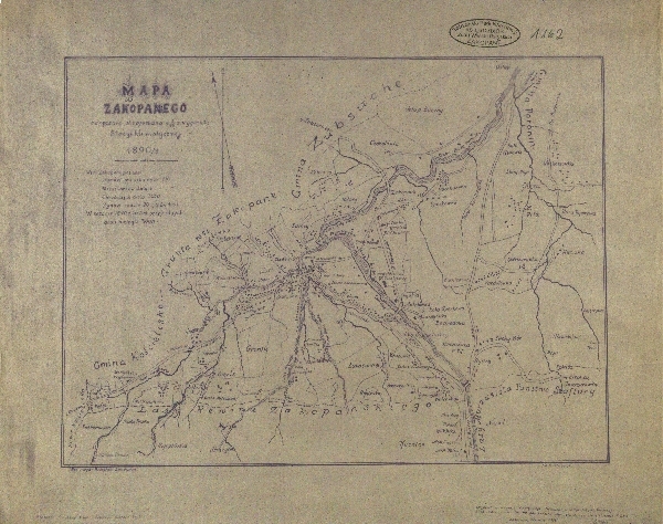 Pierwszy szczegółowy plan Zakopanego z zaznaczonymi rzekami, ulicami i budynkami. Oryginał w zbiorach W. Paryskiego-Zakopane (litografia uszkodzona). Skopiowano z odbitki na pap. światłoczułym, znajdującej się w zbiorach H. Josta. Zakopane, czerwiec 1955.
