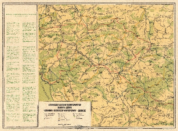 Mapa turystyczna Babiej Góry, Orawy, Beskidu Wyspowego i Gorców. Zaznaczona sieć hydrograficzna. i obszary leśne. Sieć komunikacyjna - koleje i drogi. Osadnictwo. Podane wysokości szczytów. Zaznaczone szlaki turystyczne i schroniska. Obok opis obiektów turystycznych. Legenda.