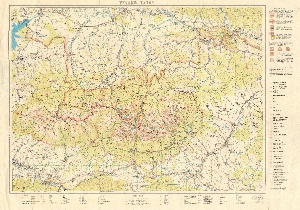 Mapa turystyczna obejmująca całe Tatry i Pieniny. Rzeźba przedstawiona poziomicami i punktami wysokości, w obszarze wysokogórskim rysunek skał. Sieć hydrograficzna. Zaznaczono obszary zalesione. Komunikacja - koleje i drogi, koleje linowe. Osadnictwo. Zaznaczone granice państwowe i administracyjne, granice parków narodowych i rezerwatów przyrody, szlaki turystyczne, obiekty turystyczne, zabytki, obiekty użyteczności publicznej, obiekty sportowe. Objaśnienia w j. pol. i słow. Tabela znaków turystycznych.
