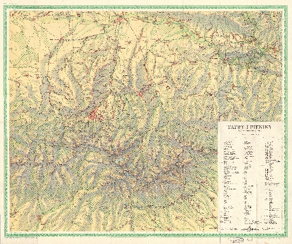 Mapa turystyczna obejmująca Tatry i Pieniny. Rzeźba zaznaczona przy pomocy poziomic, cieniowania i punktów wysokościowych. W obszarze wysokogórskim rysunek skał. Sieć hydrograficzna. Zaznaczono obszary zalesione. Komunikacja - koleje, drogi, koleje linowe. Osadnictwo. Zaznaczono granice państwowe, granice parków narodowych i rezerwatów ścisłych. Obiekty turystyczne, zabytki, obiekty użyteczności publicznej ,szlaki turystyczne, nartostrady. Objaśnienia w j. pol., fr., niem. i ros.