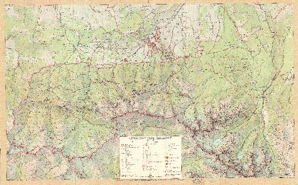 Mapa turystyczna TPN oraz Zakopanego i Pogórza Gubałowskiego. Rzeźba przedstawiona metodą poziomic i cieniowania. W obszarze wysokogórskim rysunek skał. Sieć hydrograficzna. Zaznaczone obszary zalesione. Komunikacja - koleje linowe i wyciągi narciarskie, drogi. Osadnictwo. Zaznaczone granice parku narodowego i rezerwatów. Zaznaczone szlaki turystyczne, niebezpieczeństwo lawin, nartostrady, szlaki narciarskie i tereny zjazdowe. Schroniska oraz muzea i obiekty użyteczności publicznej. Legenda.