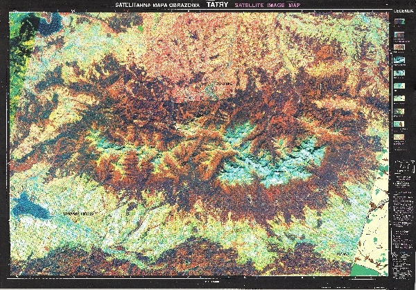 Mapa satelitarna, wykonana na podstawie zdjęcia satelity SPOT 1 w 1992 r., obejmująca Tatry i Podtatrze. Poza ramką mapy legenda.