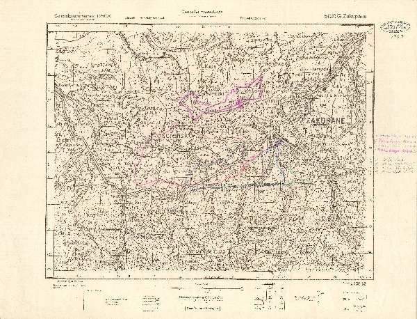 Mapa topograficzna obejmująca Podhale, rejon Zakopanego i północną część Tatr Zachodnich. Rzeźba przedstawiona metodą poziomic. Sieć hydrograficzna. Zaznaczone obszary zalesione. Komunikacja - drogi i kolej. Osadnictwo.