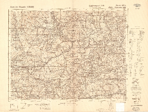 Mapa topograficzna Słowacji obejmująca okolicę Turzovký. Rzeźba przedstawiona metodą poziomic i punktów wysokościowych. Topograficzne szczegóły rzeźby. Sieć hydrograficzna. Komunikacja - drogi i koleje. Osadnictwo. Zaznaczone granice administracyjne. Legenda.