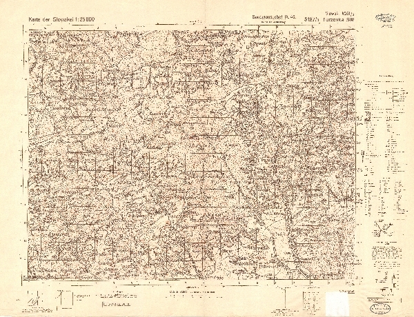 Mapa topograficzna Słowacji obejmująca okolicę Turzovký. Rzeźba przedstawiona metodą poziomic i punktów wysokościowych. Topograficzne szczegóły rzeźby. Sieć hydrograficzna. Komunikacja - drogi i koleje. Osadnictwo. Zaznaczone granice administracyjne. Legenda.