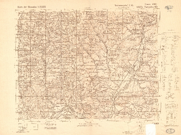 Mapa topograficzna Słowacji obejmująca okolicę Turzovký. Rzeźba przedstawiona metodą poziomic i punktów wysokościowych. Topograficzne szczegóły rzeźby. Sieć hydrograficzna. Komunikacja - drogi i koleje. Osadnictwo. Zaznaczone granice administracyjne. Legenda.