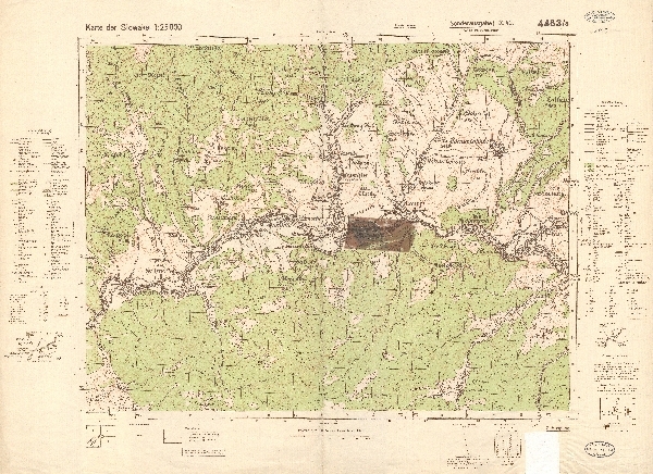 Mapa topograficzna obejmująca Lopej. Rzeźba przedstawiona metodą poziomic i punktów wysokościowych. Zaznaczone obszary zalesione. Topograficzne szczegóły rzeźby. Sieć hydrograficzna. Komunikacja - drogi i koleje. Osadnictwo. Zaznaczone granice administracyjne. Legenda w j. cz., niem. i pol.