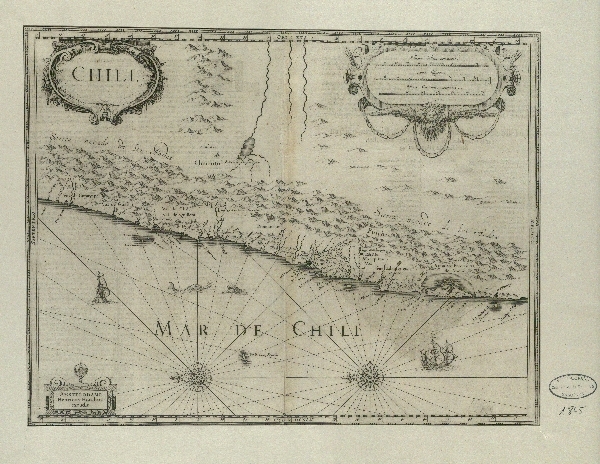 Mapa przeglądowa wybrzeża Chile z Atlasu Henricusa Hondiusa. Dwa portolany. Brak siatki południków i równoleżników. Przedstawiono rysunek wybrzeża i sąsiadujących z nim gór. Rzeźba zaznaczona szrafowanymi kopcami. Sieć hydrograficzna. Osadnictwo. Podziałka liniowa w milach niemieckich i galicyjskich, leuca hiszpańskie.