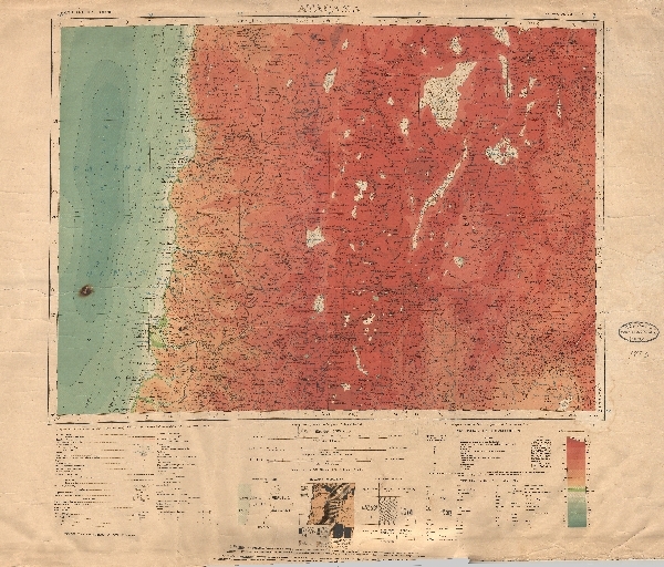 Mapa przeglądowa rejonu Atacama. Rzeźba przedstawiona przy pomocy poziomic i barw hipsometrycznych. Zaznaczone punkty wysokościowe. Sieć hydrograficzna. Komunikacja - drogi i linie kolejowe. Osadnictwo. Kopalnie. Zaznaczone granice administracyjne. Legenda.