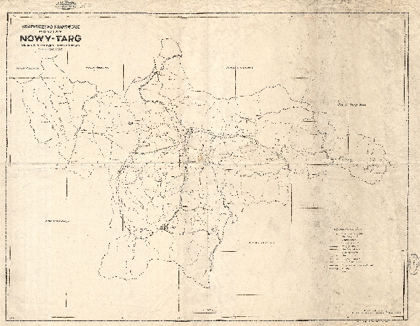 Mapa administracyjna, komunikacyjna powiatu Nowy Targ. Zaznaczone rzeki. Komunikacja - drogi i koleje. Osadnictwo. Granice administracyjne. Legenda.