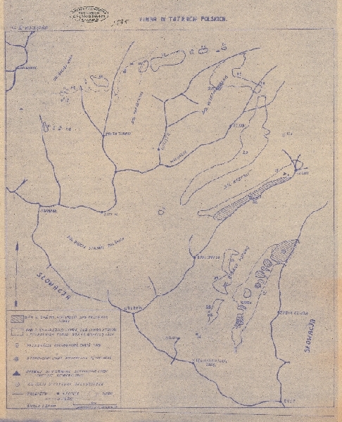 Mapa ukazująca rozmieszczenie limby w Tatrach Polskich na podstawie badań autora. Zaznaczone grzbiety i cieki wodne oraz stanowiska i miejsca występowania limby. Objaśnienia.
