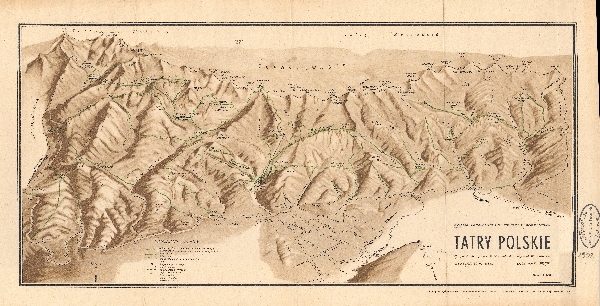 Widok panoramiczny na Tatry Wysokie i Tatry Zachodnie od północy. Zaznaczone szlaki turystyczne i nartostrady, schroniska i obiekty turystyczne, drogi dojazdów. Koleje linowe. Plan Zakopanego.