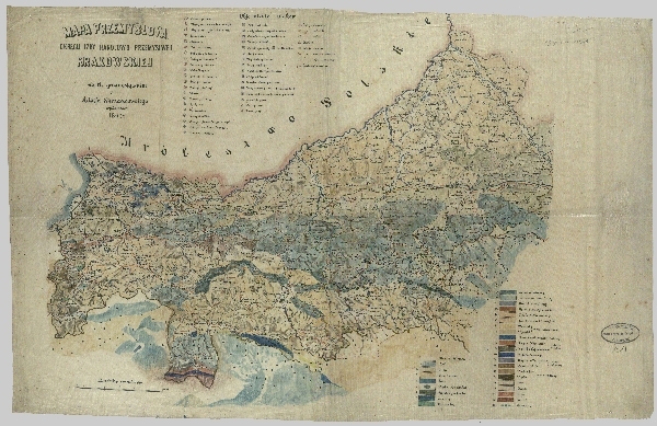 Rękopiśmienna mapa przemysłowa Izby Handlowo-Przemysłowej Krakowskiej obejmująca zachodnią Galicję. Naniesiona sieć hydrograficzna. Budowa geologiczna podłoża. Osadnictwo. Komunikacja - drogi i koleje. Zaznaczone zakłady produkcyjne, fabryki, kopalnie, kamieniołomy, zakłady kąpielowe. Objaśnienia użytych znaków i skał.
