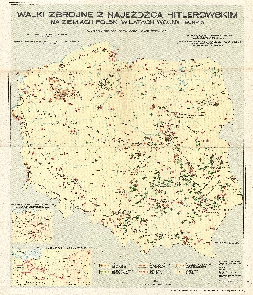 Mapa przeglądowa Polski z zaznaczonymi miejscami walk zbrojnych w czasie II wojny światowej. Zaznaczone ważniejsze rzeki. Dodatkowo mapa linii kolejowych szczególnie atakowanych przez partyzantów oraz mapa szlaku bojowego Ludowego Wojska Polskiego. Legenda w j. pol., ros., ang., fr., niem.