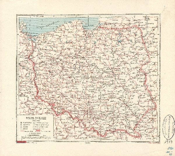 Mapa administracyjna Polski. Zaznaczona sieć hydrograficzna. Komunikacja - koleje. Osadnictwo. Zaznaczone granice państwa - stan z 1XII.1945. Objaśnienia.