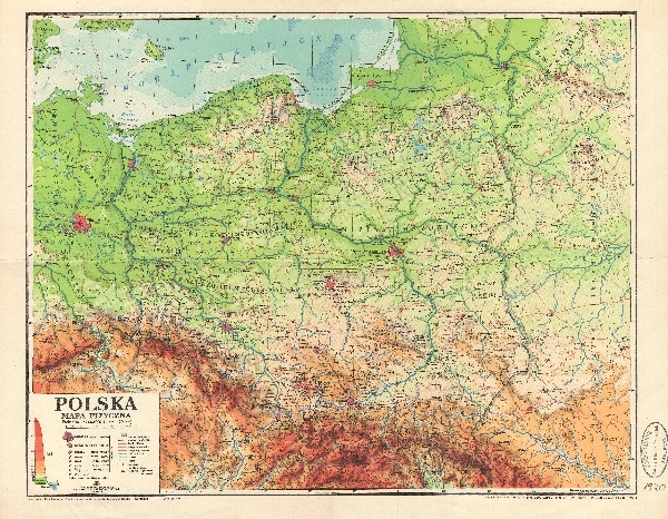 Mapa przeglądowa, fizyczna Polski. Rzeźba przedstawiona przy pomocy poziomic, cieniowania i barw hipsometrycznych. Zaznaczone punkty wysokościowe. Zaznaczona sieć hydrograficzna. Komunikacja - koleje. Osadnictwo. Objaśnienia.