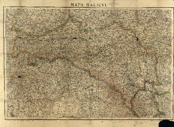 Mapa administracyjna Galicji. Punkty wysokościowe. Obszary górskie zaznaczone kolorem brązowym. Sieć hydrograficzna. Komunikacja - koleje i drogi. Osadnictwo. Podział administracyjny. Objaśnienia.
