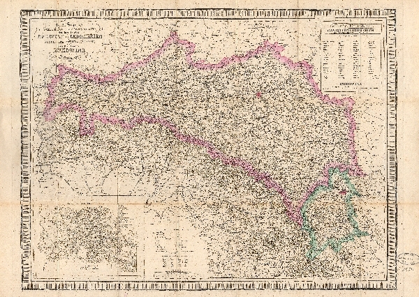 Mapa pocztowo - drogowa Galicji i Lodomerii. Rzeźba przedstawiona metodą kresek. Sieć hydrograficzna. Komunikacja - ważniejsze drogi i linie kolejowe. Osadnictwo. Zaznaczone obiekty użyteczności publicznej. Zaznaczono granice administracyjne różnego szczebla. Dodatkowo plan centrum Lwowa, podane objaśnienia. Dodatkowo spis powiatów.